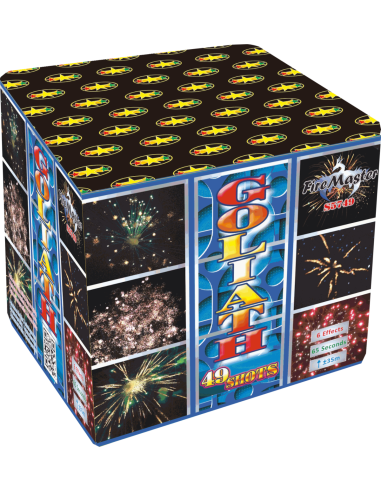 55 secondes et 5 effets pour cet impressionnant feu d'artifice compact Goliath, qui fera scintiller la nuit avec ses étoiles d'artifice jusque 35m de hauteur !